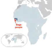 The Baga are a West African ethnic group who live in the southern swampy lands of Guinea Atlantic coastline.[1] Traditionally animist through the pre-colonial times, they converted to Islam during the mid-eighteenth century under the influence of Muslim Mandé missionaries. Some continue to practice their traditional rituals.[2][3]