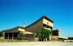 Baghdad Gymnasium (Arabic: صالة الجمنيزيوم للألعاب الرياضية), formerly Saddam Hussein Gymnasium, is a sports complex in Baghdad, Iraq adjacent to the Al-Shaab Stadium. Designed by Le Corbusier under the commission of King Faisal II in 1956 for potential use in the 1960 Summer Olympics. After Faisal II was overthrown in a military coup in 1958 the project went through several changes of design and location. The architect died in 1965, leaving a wealth of drawings and studies for the multi functions of Baghdad's Sports Complex that included a large stadium, tennis courts, swimming pools and a gymnasium. Only the later was finally built between 1978 and 1980, to be inaugurated by and named after Iraq's president Saddam Hussein. The American army troops occupied the Gymnasium as well as the Shaab district for some years following the Fall of Baghdad in 2003.[1]