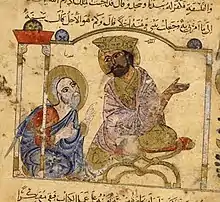 The Abbasid artist, Yahya Al-Wasiti, who probably lived in Baghdad in the late Abbasid era (12th to 13th-centuries), was one of the pre-eminent exponents of the Baghdad school. In 1236-37, he is known to have transcribed and illustrated the book, Maqamat (also known as the Assemblies or the Sessions), a series of anecdotes of social satire written by Al-Hariri of Basra.[12] The narrative concerns the travels of a middle-aged man as he uses his charm and eloquence to swindle his way across the Arabic world.[6]