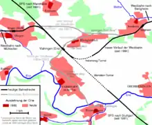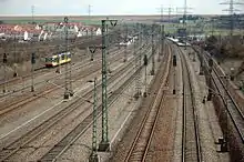 Passenger traffic at the existing station in the centre of Vaihingen was abandoned at the timetable change of 30 September 1990.[8][10] At the same time the existing line was rerouted on a 7.31 km long section and a 1.36 km long single-track branch line to Vaihingen (Enz) North was put into operation.[8]