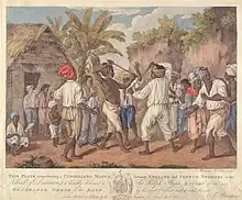 The earliest reference to stick fighting in the Caribbean was from a lithograph completed in Dominica in 1779 by an Italian artist, Agostino Brunias.[2] In the image, there are two persons in the middle and other stick fighters and watchers gathered around them; some who are willing to fight and others that are old and experienced observing and refereeing the fight.