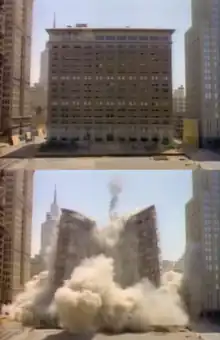 The Baker Hotel on June 29th, 1980. The image above shows the hotel seconds before destruction, and the image below shows the hotel crumbling to the ground.