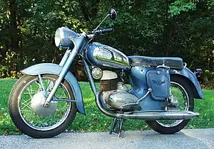Production of the M2 began in 1959. Numerous changes were made during the modernization of the motorcycle, most notably a chrome side cover of the tank was added, in which there was a new emblem of the Balkan company. The MD 250 engine, which had a volume of 247.3 cm³, 12.5 PS at 4800 rpm, consumption of 3.3 - 3.5 liters per 100 km and four gears.[2] It was mechanically identical to the engine of DKW 250 RT. Three engineers were sent for training to the Jawa-ČZ,[3] so it was visually similar to Jawa 250/353 "Kývačka".