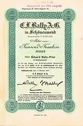 Bally was founded as a shoe making business in 1851 by Carl Franz Bally and his brother Fritz in the basement of their family home in Schönenwerd, Solothurn, Switzerland. Carl Franz Bally had joined the family business, a silk ribbon manufacturer, when he was 17, but decided to go into shoe manufacturing after a stay in Paris. After Carl's death in 1899, the company continued under the management of Carl's sons, Eduard and Arthur[2] and continued to manufacture about two million pairs of shoes a year, employing 3,200 people.[3]