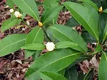 Leaves are alternate on the stem, not toothed. Lanceolate to reverse ovate in shape, glossy green. 8 to 15 cm long, 2 to 5 cm wide.[3] A pair of glands occurs on the edge of the leaf, about 5 mm from where the stalk joins the leaf. Leaf stalks 2 to 4 cm long, with a grooved channel on the upper side.