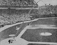 The only home run ball ever hit completely out of Memorial Stadium was slugged by Frank Robinson on Mother's Day, May 8, 1966, off Cleveland Indians pitcher Luis Tiant.[31] It cleared the left field single-deck portion of the grandstand.[32] A flag was later erected near the spot the ball cleared the back wall, with simply the word "HERE" upon it.