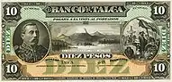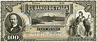 On October 27, 1885, it opened his first branch in Cauquenes, later opening branches in Parral (September 1, 1888) and Linares (January 27, 1890).[4][5] Like several banks of that time in Chile, Banco de Talca issued its own money, which was made through the printing of 5, 10, 20 and 100 peso notes; the first 5, 10 and 100 peso issues (made in 1885) included portraits of generals of the War of the Pacific, Benjamín Vicuña Mackenna and José Francisco Vergara, while the 20 pesos banknotes (made in 1888) carried the portrait of Tomás Marín de Poveda, founder of the city.[1]