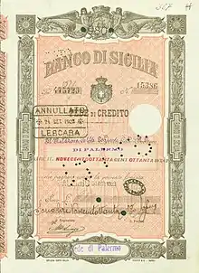 Fede di Credito of the Banco di Sicilia, issued 30 August 1923