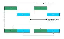 Centre gap is a key characteristic of FDD-based frequency arrangement represented by the gap between frequency blocks assigned for downlink and uplink respectively in the FDD-based arrangement as illustrated in Figure 5. It is common understanding that the duplex spacing and centre gap influence the duplexer performance so that larger separation brings the better isolation performance between downlink and uplink. Technically, this size of spacing affects the duplexer performance in the following two technical aspects: