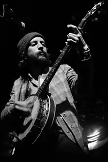 Banditos began in 2010 when singer/guitarist Corey Parsons and singer/banjo player Stephen Pierce starting playing acoustic music in Birmingham's local indie/rock scene.[5] They busked around the city and were eventually invited to play a show at their favorite local saloon.[6] They added Mary Beth Richardson on vocals and percussion, Randy Wade on drums, Danny Vines on bass, and Jeffery Salter playing lead guitar.[7] Pierce's non-traditional banjo playing throughout their music adds to the honky-tonk and garage elements of their sound.[8] Lead guitarist Salter, who grew up with Parsons and Vines in Hueytown, Alabama,[9] is trained in jazz and classical guitar from University of Alabama at Birmingham and works as a luthier, building custom guitars as part of his company, Pyrose Wood Works.[10] The band's name comes from the idea of a band of friends getting together. The band's name is not associated with the Bandidos Motorcycle Club, although Bandidos members have come to see the band play a few times.[9]