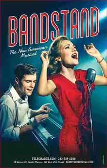 The musical, once again titled Bandstand, premiered on Broadway at the Bernard B. Jacobs Theatre on April 26, 2017, after starting previews on March 31, with Osnes and Cott and direction and choreography by Andy Blankenbuehler.[6] The Broadway cast features Beth Leavel, Alex Bender, Joe Carroll, Brandon James Ellis, James Nathan Hopkins, and Geoff Packard.[7][8] The production closed on Broadway on September 17, 2017, after 24 previews and 166 regular performances.[9]