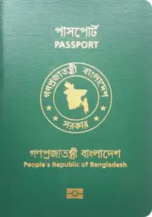 Bangladeshi passport covers are dark green, with the Seal of the Government of Bangladesh emblazoned in gold in the centre of the front cover. The word "পাসপোর্ট" (Bengali) and "Passport" (English) are inscribed above the Seal. Below the Seal "গণপ্রজাতন্ত্রী বাংলাদেশ" (Bengali); "People's Republic of Bangladesh" (English); and the international e-passport symbol (