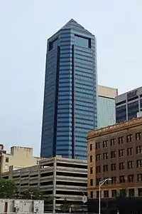Bank of America Tower (originally Barnett Center) is a skyscraper in the downtown area of Jacksonville, Florida, at the northwest corner of Bay and Laura streets. At 617 ft (188 m), it is the tallest building in Jacksonville,[1] the 25th-tallest in Florida, and the tallest building in Florida outside of the Miami metropolitan area. It was built as the headquarters of Barnett Bank and originally named Barnett Center, but the name was changed to NationsBank Tower in 1998 after Barnett Bank was acquired by NationsBank. NationsBank was soon acquired by Bank of America and the building's name was changed to Bank of America Tower in 1999. The 42-floor structure was designed by German-American architect Helmut Jahn, and is constructed of reinforced concrete.