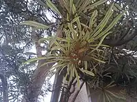 Although the inflorescences of Banksia aquilonia are similar to B. integrifolia, the leaves are marked in their differences—the midrib on the leaves' undersides is distinctively covered in short reddish-brown hairs and the leaves are spirally arranged on the branches rather than in whorls as in all B. integrifolia subspecies. It was these differences that George felt were distinctive enough for it to be separate it as a full species from B. integrifolia.[8] The overall habit of a Banksia aquilonia tree resembles that of B. integrifolia, though is generally smaller.[6] The southernmost populations of B. aquilonia are separated from the northernmost B. integrifolia occurrence by 200 km (120 mi),[9] hence location is helpful in identification.[6]