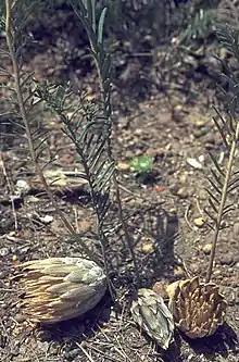 Banksia bipinnatifida is a prostrate shrub with a lignotuber, an underground stem and only a few above-ground leaves. The leaves are bipinnatipartite, meaning that they are deeply lobed, the lobes themselves lobed, giving the impression of a bipinnate leaf. Each leaf is 70–330 mm (2.8–13.0 in) long and 30–70 mm (1.2–2.8 in) wide in outline, the lobes linear in shape, about 50 mm (2.0 in) long and the secondary lobes up to 17 mm (0.67 in) long. The edges of the leaflets are rolled under and hairy on the lower surface. The flower spikes develop on the ends of the underground stem with thirty for forty-five flowers in each spike, each flower surrounded by bracts 45–80 mm (1.8–3.1 in) long. The perianth is pink and cream-coloured to pale yellow, 40–57 mm (1.6–2.2 in) long and the pistil is 43–60 mm (1.7–2.4 in) long. Flowering occurs from October to November and the fruit is an egg-shaped follicle 17–23 mm (0.67–0.91 in) long and 13–17 mm (0.51–0.67 in) wide.[2][3][4]