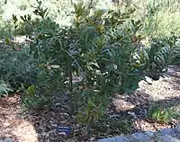 Banksia lemanniana grows as an open shrub or, less commonly, a small tree to 5 m (16 ft) in height, with a spreading habit. The trunk has thin grey bark and can reach a diameter of 15 cm (5.9 in).[2] Lower-growing plants that reach 1.6 m (5.2 ft) have been reported from coastal areas of Fitzgerald River National Park.[3] The new growth is finely hairy and predominantly seen in summer,[4] before losing its hair and becoming glabrous (smooth) over two years. The stiff leaves are narrowly wedge-shaped or more oval (cuneate to obovate) and measure 3–9 cm (1.2–3.5 in) in length by 1.2–3 cm (0.47–1.18 in) wide. The leaf margins are serrated, with many teeth measuring 0.1 to 0.3 cm each.[5]