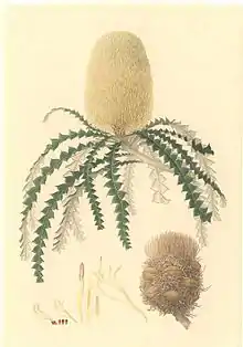 The cream to yellow flower spikes, known as inflorescences, can appear at any time of year.[3] They arise on the ends of one- or two-year-old stems and are roughly cylindrical in shape with a domed apex,[3][4] measuring 4–12 cm (1.6–4.7 in) high and 9–10 cm (3.5–3.9 in) wide at anthesis. Each is a compound flowering structure, with a large number of individual flowers arising out of a central woody axis.[3] A field study on the southern sandplains revealed an average count of 1369±79 on each spike.[6] The perianth is grey-cream in bud, maturing to a more yellow or cream. The style is cream and the tip of the pollen-presenter maroon. Ageing spikes are grey, with old flowers remaining on them, and develop up to 20 large red follicles each. Roughly oval and jutting out prominently from the spike, each follicle is 3.5–5 cm (1.4–2.0 in) long by 2–3 cm (0.8–1 in) wide and 2–3 cm (0.8–1 in) high and is covered in dense fur, red-brown initially before aging to grey. It remains closed until opened by bushfire, and contains one or two viable seeds.[3]