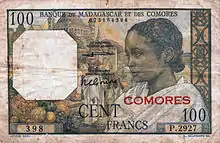 When the Comoro Islands became a separate French territory in 1946, the name of the issuing bank was changed to Banque de Madagascar et des Comores. A branch office opened in Comoros in 1953. While the banknotes were changed to reflect the new status of Comoros, the coins were not changed and bore only the name Madagascar.