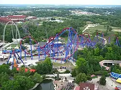 The foundation work for the supports was done by R.E. Middleton, and the rest of the ride's construction was performed by Adena Corporation.[24] The first pieces of track and supports were delivered to the park from Clermont Steel Fabricators on August 16, 2013;[7][25] the first track piece was erected on August 27, 2013.[26] The lift hill was completed on September 29, 2013,[27] and by the end of October, other elements such as the first drop, dive loop, and vertical loop were installed.[28][29] Work on the station commenced that November,[29] and the ride was 40 percent complete by the next month.[30] The final piece of track was installed on January 23, 2014.[31][32] Workers began installing the ride's trains that February,[33] and testing began on March 15.[34][35][36]