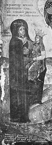 Teodosie's body being held up by his mother, Princess Milica, in a contemporary votive icon. The Prince's death transferred his claim to collateral Craiovești, including Mărăcine