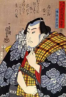 Banzuiin Chōbei (1622–1657)(幡随院長兵衛) was a historical street tough of Japan's Edo period who, according to later fictionalized portrayals of his life in literature and drama, fought against injustices, and to protect the common people from the abuses of the samurai aristocracy.[1] Born in Karatsu as Tsukamoto Itarō (塚本伊太郎), he established himself in the Asakusa district of Edo, where he led of a band of machi-yakko and founded an employment agency for rōnin. Trained as a warrior, he was renowned for his swordsmanship.