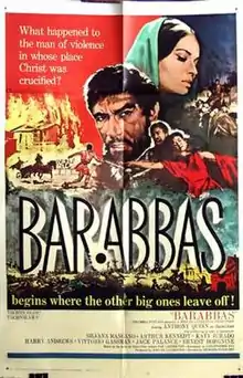 Barabbas (Italian: Barabba[1]) is a 1961 religious epic film directed by Richard Fleischer for Dino De Laurentiis Cinematografica, expanding on the life of Barabbas, from the Christian Passion narrative in the Gospel of Mark and other gospels. It stars Anthony Quinn, Silvana Mangano, Katy Jurado, Arthur Kennedy, Harry Andrews, Ernest Borgnine, Vittorio Gassman, and Jack Palance. The screenplay is based on Nobel Prize-winner Pär Lagerkvist's 1950 novel of the same title.