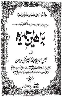 Al-Barāhīn al-Ahmadīyyah 'alā Haqīqatu Kitāb Allāh al-Qur'ān wa'n-Nabūwwatu al-Muhammadīyyah (Ahmadiyya Arguments in Support of the Book of Allah - the Qur'an, and the Prophethood of Muhammad) is a five-part book written by Mirza Ghulam Ahmad, the founder of the Ahmadiyya Movement. The first two parts were published in 1880 CE, the third volume was published in 1882, the fourth volume in 1884 and the fifth volume in 1905. In writing the book, Ghulam Ahmad sought to rejuvenate Islam by arguing for the validity of its principles and vindicating its teachings in response to Christian and Hindu polemics against Islam as well as atheistic philosophies.[1] In this context, a significant portion of the subject matter of the book is dedicated to the defence of Islam as a whole against the criticism of Muhammad, the Qur'an and Islam that was raised in the 18th and 19th centuries predominantly by Christian missionaries and Hindu revivalists.