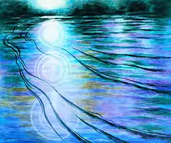 In the late 1990s until her death in 2002, Howard returned to her lifelong fascination with light, night skies, the reflective surface of water. In these last paintings, there is a recurrence of circular elements, an abstraction of natural forms and a balancing of darkness and light.[2] Howard has stated: "In my painting (as in all my work) I am deeply involved with light as the movement and inter-action of colours; the integrity of colour and form, hence with the integrity of the total work which has to do with spirit and abstract essence, not representation. I am preoccupied with life's ambiguities and dualities and in my later work I am reaching more and more from the dark toward light, freedom, and a transcending exuberance."[8]