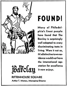 1. 1 2 Belden, Tom (November 5, 1994). "Barclay Will Make Transition To Condos. The Luxury Hotel Was Sold For $4.3 Million. Its Owner Intends To Convert It 'In A First-class Way.'". The Philadelphia Inquirer. Philadelphia Media Network (Digital) LLC. Retrieved 17 September 2014.