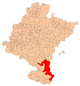 The Bardenas is in the southeast of Navarre, bordering Aragon. It is located in the middle of the depression of the Ebro valley at the foot of the mountains of the Yugo and the Zaragoza region of Cinco Villas. It is 45 km (28 mi) from north to south and 24 km (15 mi) east-west and at an altitude ranging between 280 and 659 m (919 and 2,162 ft). Its area is 41,845 hectares (418.45 km2; 103,400 acres). There are only sixteen municipalities, of which thirteen are in Navarre and three in the province of Zaragoza. The Navarrese are Valtierra, Arguedas, Carcastillo, Santacara, Mélida, Rada, Caparroso, Villafranca, Cadreita, Tudela, Cabanillas, Fustiñana and Buñuel, while the Zaragozan are: Tauste, Ejea de los Caballeros and Sádaba.