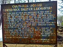 Barechhina is also noted for its two pre-historic painted rock shelters, at 'Lakhudiyar', which literally means 'one lakh caves',[2] on the banks of Suyal river, it has with paintings of animals, humans and also tectiforms done with fingers in black, red and white colours,[3][4] and engravings of trishul and Swastika.[5]