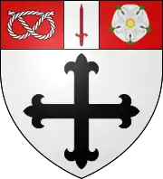 ![]() ![]() Argent a cross flory sable, a chief gules, thereon between a Stafford knot and a rose argent, barbed and seeded proper, a pale also argent charged with a sword erect gules | |