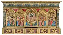 Gaddi also designed the stained glasses, with four prophets on the exterior, and perhaps had a hand in the altarpiece also: this, dating to c. 1328, has the signature Opus Magistri Jocti, but the style shows the hands of assistants, including Gaddi himself. It is an elaborate polyptych, depicting the Coronation of the Virgin surrounded by a crowded Glory of Angels and Saints. The cusp of the altarpiece is now at the San Diego Museum of Art of San Diego, California, United States. The original frame was replaced by a new one during the 15th century.