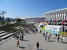 The site of the Barra Olympic Park was formerly occupied by the Autódromo Internacional Nelson Piquet, also known as Jacarepaguá.[3][4] It was a former Formula One circuit that hosted the Brazilian Grand Prix on a number of occasions throughout the 1980s, before the Grand Prix went back to its original home at the Autódromo José Carlos Pace, Interlagos, in 1990. Jacarepaguá was partly demolished to make way for the City of Sports Complex, a cluster of three venues constructed for the 2007 Pan American Games, held in Rio de Janeiro. The venues consisted the Maria Lenk Aquatic Center, which held diving, swimming and synchronized swimming events, the Rio Olympic Arena, which held basketball and artistic gymnastics events, and the Barra Velodrome, which held track cycling and speed roller skating events. Construction of the City of Sports was not without setbacks – the original plan for the complex called for a large-scale entertainment complex, valued at R$ 500 million and contracted to private firms for construction. These plans, however, fell through, and a smaller-scale plan for the complex was adopted instead.[5] Opposition efforts by preservationists of the Jacarepaguá, the unsuitable soil at the construction site and numerous strike actions by workers delayed the venue's construction, which initially planned to begin in 2005, but was delayed until mid-2006.[5] Despite these challenges, the venues were completed in time for the games in July 2007, and cost a relatively cheaper R$ 205 million to construct, with venues smaller than originally planned.[5]