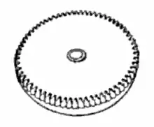 Used in mechanical watches and clocks, a barrel is a cylindrical metal box closed by a cover, with a ring of gear teeth around it, containing a spiral spring called the mainspring, which provides power to run the timepiece.[1] The barrel turns on an arbor (axle). The spring is hooked to the barrel at its outer end and to the arbor at its inner end. The barrel teeth engage the first pinion of the wheel train of the watch, usually the center wheel.[2] Barrels rotate slowly: for a watch mainspring barrel, the rate is usually one rotation every 8 hours. This construction allows the mainspring to be wound (by turning the arbour) without interrupting the tension of the spring driving the timepiece.
