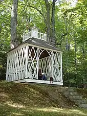 According to tradition, Forest Hall was built as a wedding gift for Charles Barrett and his bride by his father, a prosperous farmer in town who had invested in a glass factory, a toll road, a canal system, and, most successfully, in New Hampshire's first cotton mill. The interiors are elegantly furnished, and numerous reception rooms were designed for entertaining in a cosmopolitan manner. An elaborate allée was later added to the landscape, with a flight of stone steps flanked by maples rising up the hillside behind the house and leading to an elegant summerhouse.