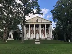 When the Brothers of the Christian Schools' property in Amawalk was condemned to make way for the New Croton Reservoir, they relocated their novitiate to Pocantico. Around 1929, the Rockefeller family purchased the property. With the proceeds from the sale, the brothers of the New York District purchased the Massena estate at the northern section of the hamlet. They moved the novitiate there[3] and established St. Joseph's Normal Institute as a teacher training facility. The Institute closed in 1969. In 1975 the property was bought by the Unification Church, where its Unification Theological Seminary is located.[4] As of August 2018, the property was again for sale.[5] - In 1824, John R. Livingston gave the 250-acre "Edgewater" property to his daughter Margaretta and her husband, Rawlins Lowndes Brown. Brown died in 1852 and the following year, his widow sold the estate to New York financier Robert Donaldson Jr., who commissioned architect Alexander Jackson Davis to add an octagonal library wing. It is now owned by a preservation trust.[6]