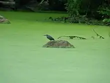 - The Woodland Pond was created by a dam where the water pauses before spilling over to Poorhouse Brook and running south to Long Island Sound. A pond is a water body small enough that its waves do not erode the soil on its banks and shallow enough for aquatic plants to root in the bottom and still reach the surface. In the summer the pond will have the round leaves and pale pink flowers of Pond Lilies (Nuphar advena) in the middle and the arrow-shaped leaves of Arrow Arum (Peltandra virginica) around the edges. When the Arrow Arum flower has gone to seed the weight of the seeds bends the stalk over and it sinks into the muddy bottom; in this way the seeds plant themselves.