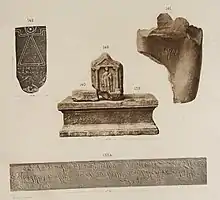 It is engraved on a rectangular block of dolomite, 61 x 20 x 29 cm, with a cavity in the top for the insertion of a statue, sculpture or other votive object linked to the cult of divinity.[1]
