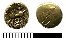 A gold Iron Age quarter stater coin from the reign of Commius, found in Basildon in 2013 and dated to c.50 – c.25 BCE[3]