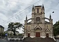 The church was built according to the design of Alexandre Grigny of Arras between 1852 and 1857[3] on the site of a former stronghold fortifications. This neo-Gothic building, whose appearance is partly inspired by Notre-Dame de Bonsecours and Saint-Nicolas of Nantes,[4] broke ground thanks to the city of Geneva, which had ceded land to religious communities to build places of worship, and through donations and manual labor provided by the Geneva Catholics. The cornerstone was laid September 8, 1852. Pope Pius IX donated 1,000 crowns towards the construction[5]