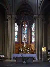 The first stained glass windows, by Claudius Lavergne, were installed from 1857 to 1875,[5] in the so-called Sulpician style. These are the 13 stained glass windows in the apse chapels and the ambulatory and the 3 rose windows.