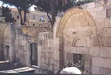 The western façade, partly ruined, is divided into three sectors. The side ones have portals with architraves, surmounted by round lunettes. The current church's entrance is in the area of the former western arm, and features modern additions from the 20th century restoration.