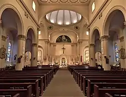 The first Catholics that moved to Daytona Beach arrived in 1881. Mass was celebrated in private homes a couple of times a year by priests who traveled from DeLand. Daytona Beach became a mission of St. Teresa Church in Titusville in 1886. Mass was now celebrated every Sunday in either the opera house or the armory. The Rev. John F. O’Boyle became the first resident priest in Daytona Beach in 1895.[1] He purchased property on South Palmetto and Myrtle Avenues and built a church in 1898. The Rev. William J. Mullally arrived in 1923 and made plans to build a school and a new church. The school, which opened in 1925, was the only Catholic school on Florida's East Coast between St. Augustine and West Palm Beach at that time. He built the present church, which was completed in 1927. Construction costs totaled around $250,000.[1] The cupola (dome) and cross on top of the building date from 2006. They replace the ones damaged in the hurricanes of 2004.