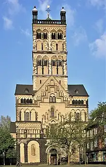 The Quirinus-Münster[1] also called Münster-Basilika of St. Quirinus of Neuss is a Catholic basilica that was erected in the city of Neuss[2] in the western part of the present state of North Rhine-Westphalia in Germany[3][4] between 1209 and 1230. The basilica is one of the best examples of Romanesque churches in Germany. It has a strong Lombard influence but in principle shows the first signs of Gothic. In its bell tower the first semicircular arches appear. This form of arch becomes centuries later in one of the marks that marked the Gothic style.