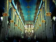 The basilica has 128 windows and skylights and two Hamburger bells. The statue of San Juan Bautista, the holy water font, the tabernacle, and the pulpit are made out of Carrara marble. Its interior is painted turquoise.[2] Its two towers and crosses are made of aluminum.