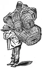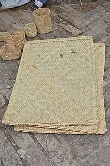 Petates are large flat mats made from reeds or palm fronds. Those made with the latter have wider weaves. They have been used to wrap bundles, to sleep on, bury the dead and event to celebrate marriages. They are still relatively common, especially in indigenous communities.[4][5] Tompeates or tenates were made to store and transport fruit, vegetables and other merchandise for market. In the pre-Hispanic and early colonial period, they were tied on a person's back with a mecapal (brace) to transport as there were no beasts of burden in the pre Hispanic period.[4] Today the term is still used in some areas to refer to a container used to keep tortillas warm. Sometimes the term tlaxcal is used instead.[1][4] Petacas were large containers used to store clothing, and in the pre Hispanic and colonial period may have been the only furniture like piece in houses of the poor.[4][1]