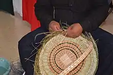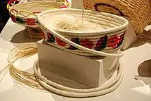 There are several main techniques associated with the making of basketry in Mexico, coils, braiding. weaving and twisting.[2][1] The techniques used vary widely over the country as it depends on the available raw materials. Three dimensional object have three parts, a center, from which the process begins, walls (sides) and edges. The oldest technique is the coil, where fibers are pressed together, coiled onto themselves and held in place by sewing them. Vestiges of this types have been found and dated archeologically, with the best-known example today being the corita baskets of the Seri people. One other technique is the twisting of fibers on themselves. This is combined with weaving in mixed technique pieces. Woven pieces start with two or more cross pieces and the thinner pieces woven over them. It is generally used to create containers, carrying pieces and mats and is the most versatile. The braiding technique is most commonly used for the making of hats.[1][4]