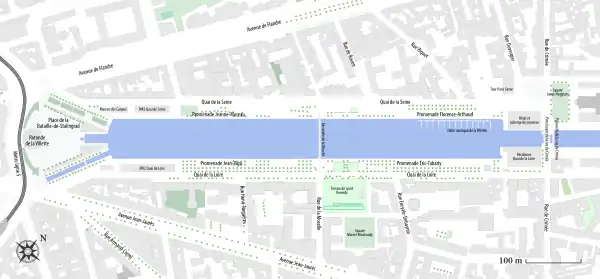 The basin is bordered in the north by the Quai de la Seine and in the south by the Quai de la Loire, which are linked in the middle of the basin by a footbridge, the Passerelle de la Moselle.