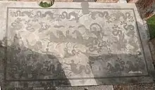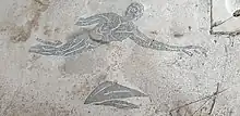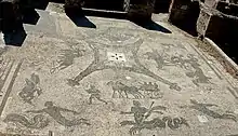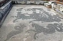 Four large black-and-white figural mosaics were found here.[43] The eponymous mosaic of Neptune riding a chariot drawn by hippocampi and surrounded by marine animals can be found after entering the bathhouse, this room is just south of the frigidarium. In an adjacent room is the mosaic of Amphitrite riding a hippocampus.[44][45] The frigidarium has a mosaic of Scylla surrounded by sea divinities.[46] The last figural mosaic is one of a group of athletes in a room to the south-east of the palaestra. There are two boxers with spiked gloves, two boxers-wrestlers, and a wrestler. None of the mosaics can be seen from any one position in the bathhouse, forcing a viewer to move through the space. The individuals in the mosaics have a three-dimensional quality to them, showing overlapping and twisting, although the scene as a whole remains flat.[43]